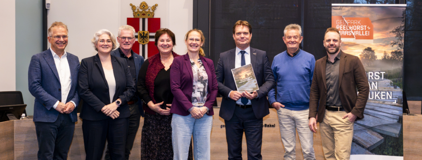 Foto van links naar rechts: Wim de Schryver gemeente Venray, Marjan Vrijnsen-de Corte Gemeente Deurne, Martien Bankers gemeente Gemert-Bakel, Jeanne van Eert Gemeente Boekel, Natasja Vaasen Gemeente Peel en Maas, Michiel van Veen voorzitter Geopark Peelhorst en Maasvallei, Rien Wijdeveen Gemeente Bernheze, Jeroen van den Heuvel Gemeente Maashorst.