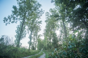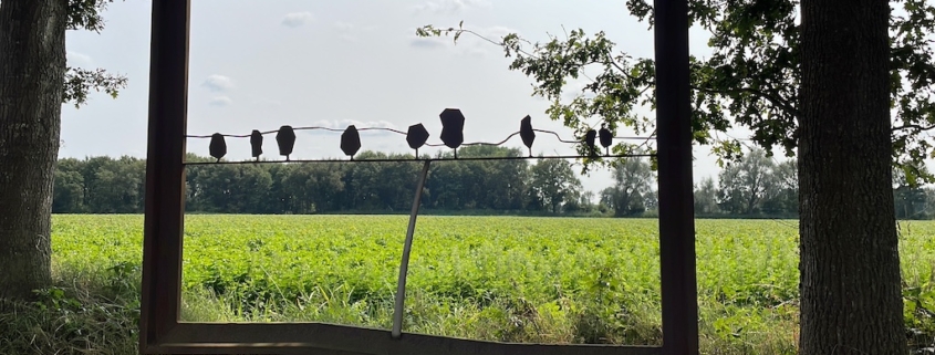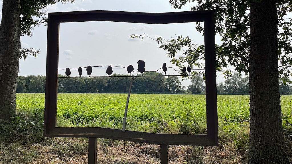 Het stalen kunstwerk toont het landschap met een bomenrij. Aan het verschil in boomsoorten die hier groeien, kun je zien dat er een breuklijn loopt. Bomen die veel vocht nodig hebben, zoals de populier en els, gedijen goed in de natte bodem in het hoge deel boven de breuk. In het lage en drogere deel langs de breuklijn doet de eik het beter.